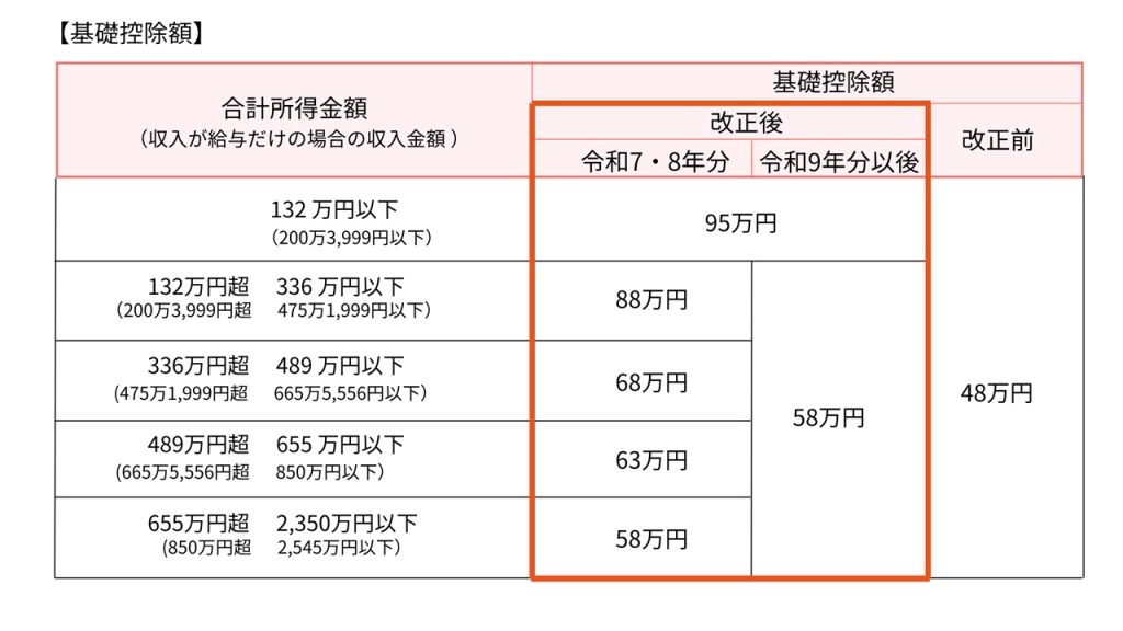 ※ただし、合計所得金額が2,400万円を超える高所得者については、基礎控除額が段階的に減少し、2,500万円を超えると基礎控除が受けられなくなる点は変わりません。