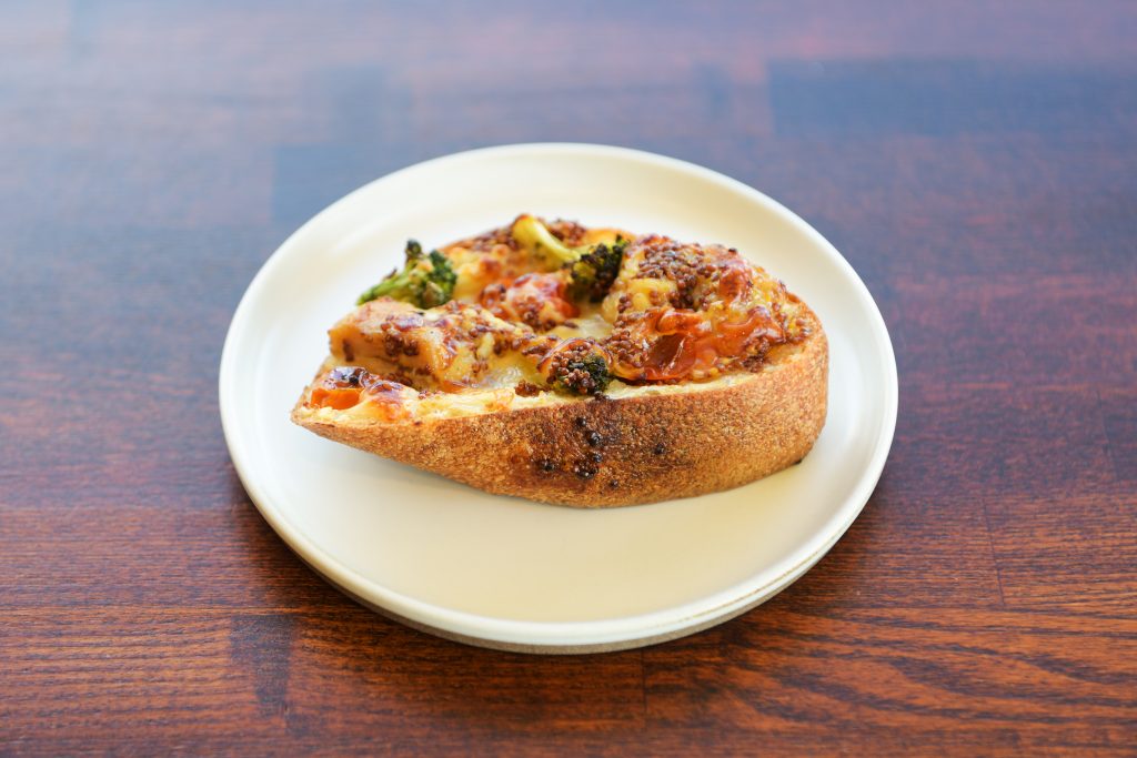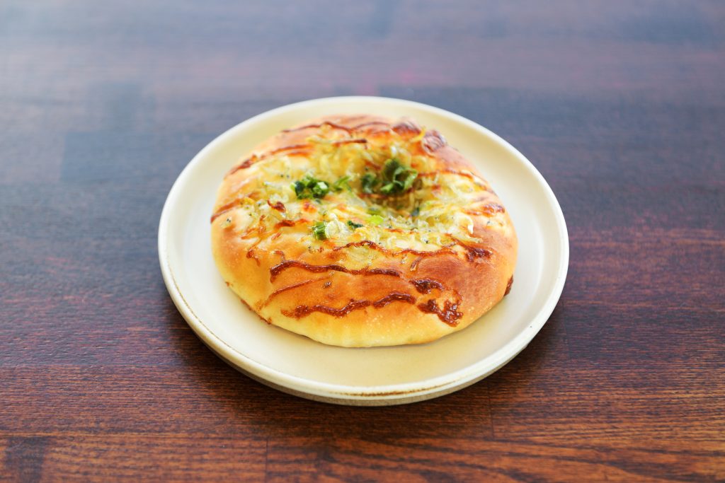 意外な組み合わせが楽しい「しらすわさびフォカッチャ」(320円)。もちもちとしたフォカッチャ生地に、わさびを混ぜ込んだベシャメルソースやしらす、チーズ、マヨネーズをトッピング。しらすのほどよい塩気がじんわり広がり、あとからわさびのほのかな辛みがふわっと抜ける、絶妙なバランスが人気の秘密です。