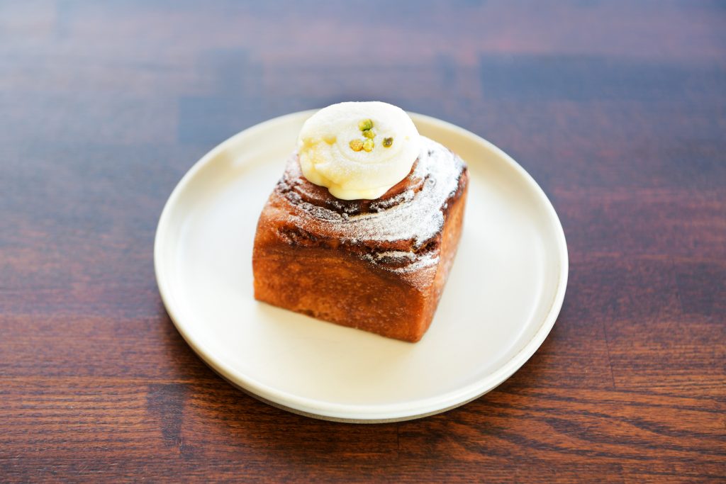「シナモンロール」(350円)は「ひとやすみ」限定商品。ブリオッシュ生地をくるりとロールして焼き上げ、クリームチーズ入りのフロスティングをたっぷりのせた、もっちりふわふわのシナモンロールです。生地自体にほんのり甘みがあるので、エスプレッソと合わせれば相性抜群。大きな口を開けて頬張りたくなるおいしさです。