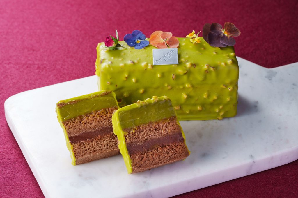 ミルクチョコのスフレに、コーヒーとピスタチオのガナッシュをサンドした、ふんわりと香ばしい味わいのデザートです。