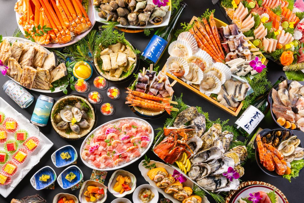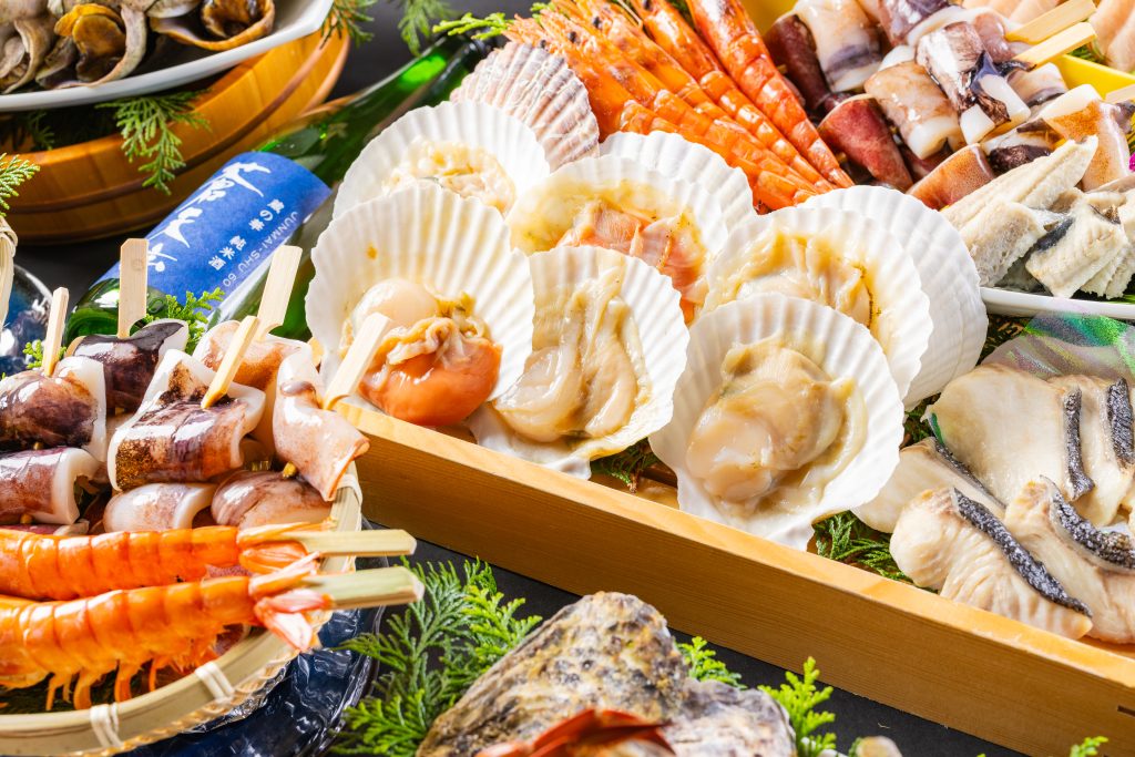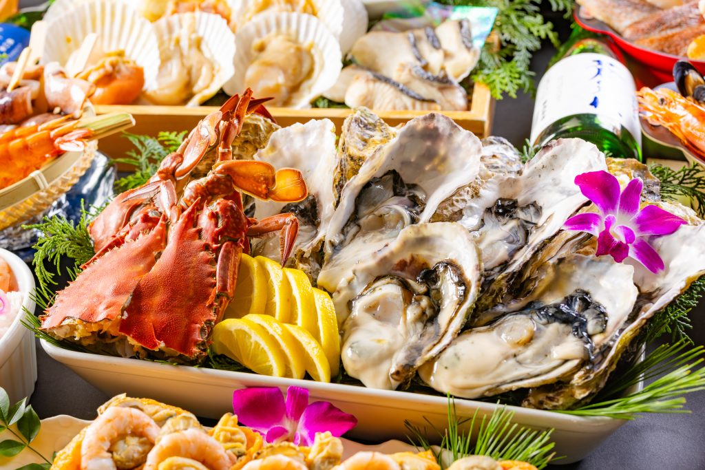 三陸産牡蠣や北海道産帆立、カニなど厳選された海の幸を焼きたて・食べ放題で味わえます。